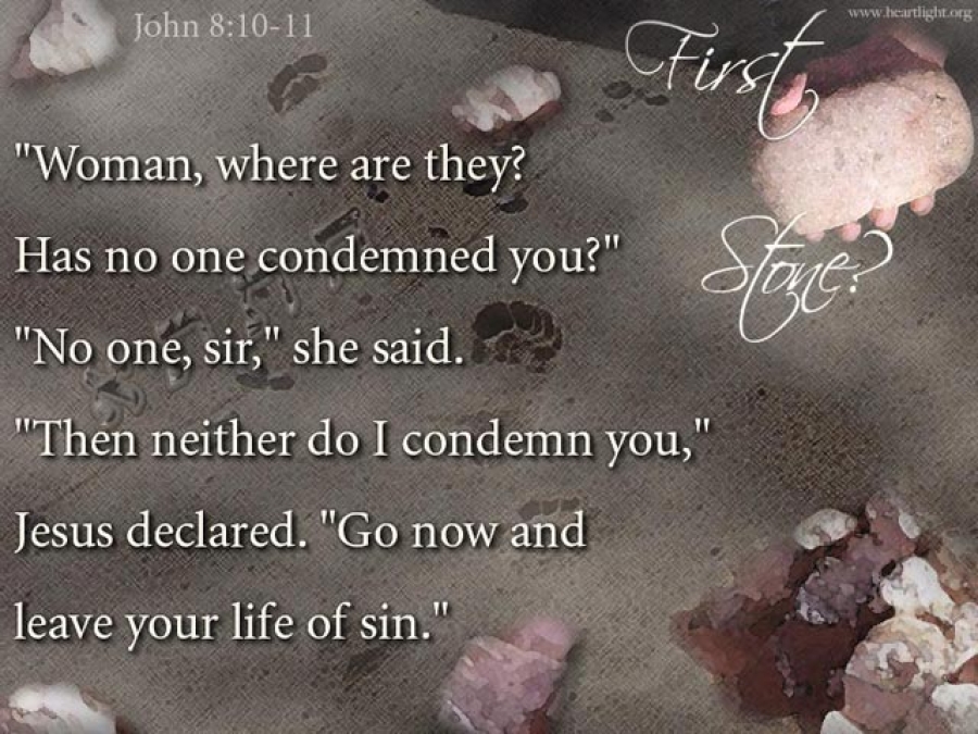 The Pharisees and the teachers of the Law of Moses brought in a woman who had been caught in bed with a man who wasn’t her husband. They made her stand in the middle of the crowd. Then they said, “Teacher, this woman was caught sleeping with a man who isn’t her husband. The Law of Moses teaches that a woman like this should be stoned to death! What do you say?” They asked Jesus this question, because they wanted to test him and bring some charge against him. But Jesus simply bent over and started writing on the ground with his finger. They kept on asking Jesus about the woman. Finally, he stood up and said, “If any of you have never sinned, then go ahead and throw the first stone at her!” Once again, he bent over and began writing on the ground. The people left one by one, beginning with the oldest. Finally, Jesus and the woman were there alone. Jesus stood up and asked her, “Where is everyone? Isn’t there anyone left to accuse you?” “No sir,” the woman answered. Then Jesus told her, “I am not going to accuse you either. You may go now, but don’t sin anymore. (John 8:3-11)
